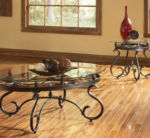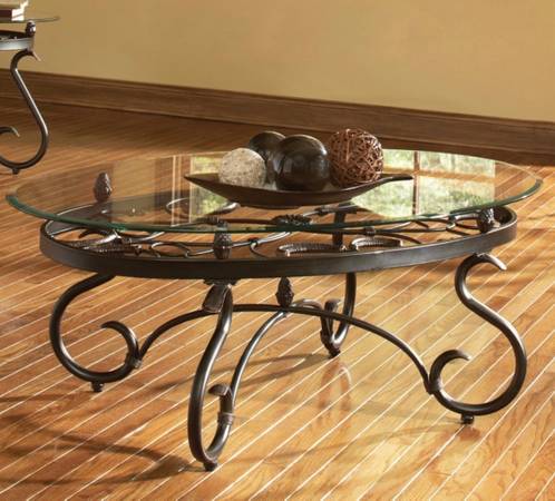 Composed of an oval coffee table and one round end tables, this elegant group is constructed with a lot of detail. Beautiful beveled glass tops are supported by scrolled antiqued metal bases.