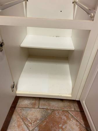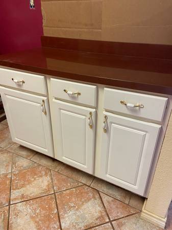 Good used cabinet includes laminated countertop. Color: as shown. Just as pictured. Dimensions: 51”w x 36”h x 24” d