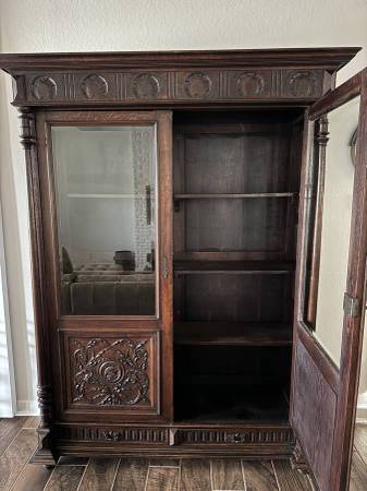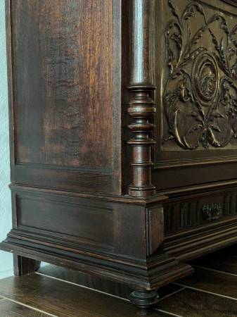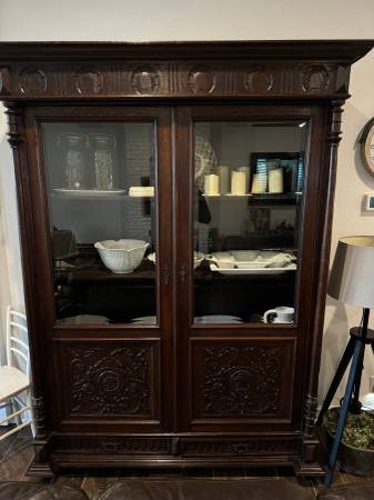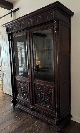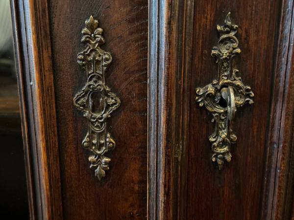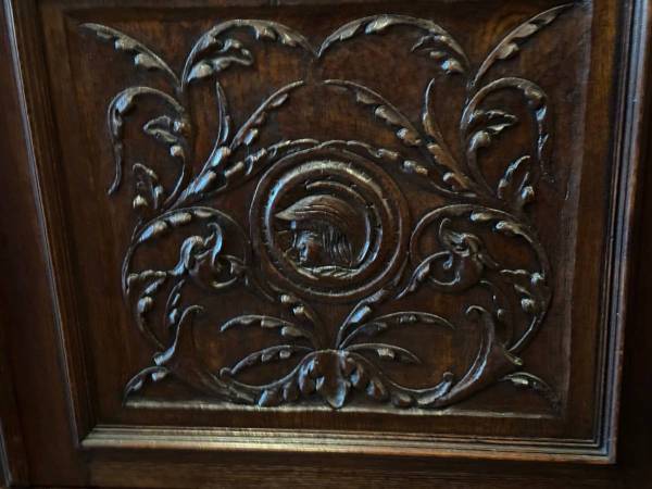 Just reduced price! Gorgeous hand-carved Belgian bookcase dating to the 1940s. Features beveled glass on the upper part of the doors, beautiful scrollwork and unique knights' profiles on the lower part. Two drawers at the bottom, three shelves plus the base inside. Skeleton key functions with the door lock. As with most Belgian furniture from that time, this bookcase completely disassembles for transport. One-of-a-kind, incredible condition, rare and sure to sell fast!