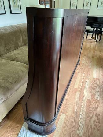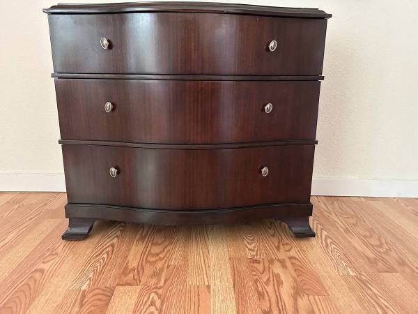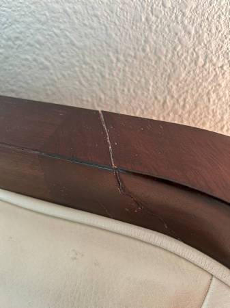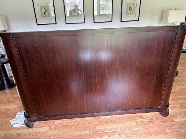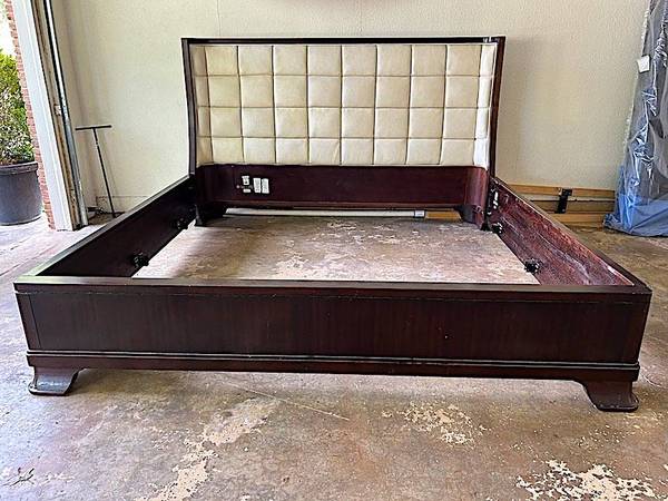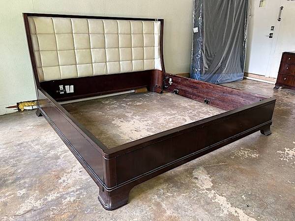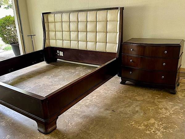 Beautiful Bernhardt bedroom set. A King size bed and two matching nightstands. High end quality. Bought at Louis Shanks for thousands more. Other than a few nicks here and there, and a small crack on the headboard, the set is in great condition. The leather on the headboard is in Excellent condition. A great deal for $850. Slats to hold the mattress included. Nightstands dimensions are 34"W X 19"D X 30.5" H. Please call or text at show contact info