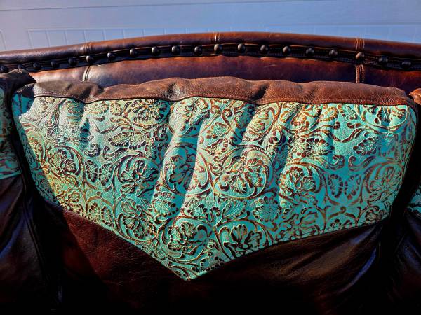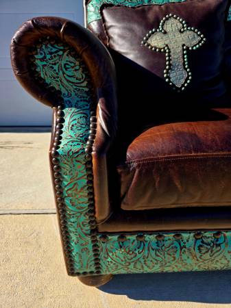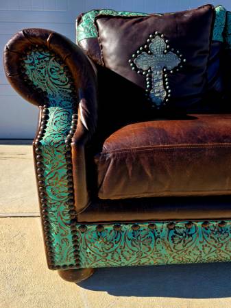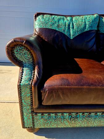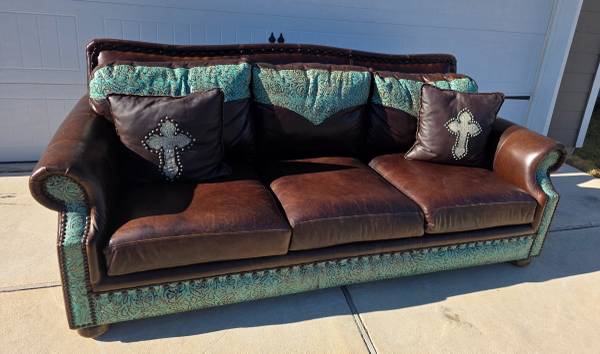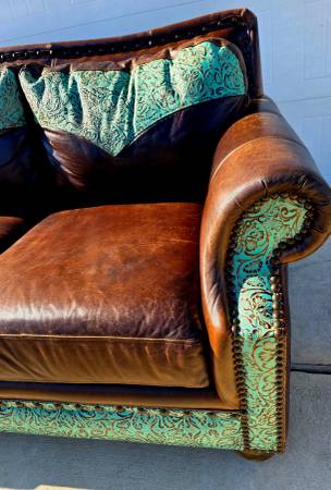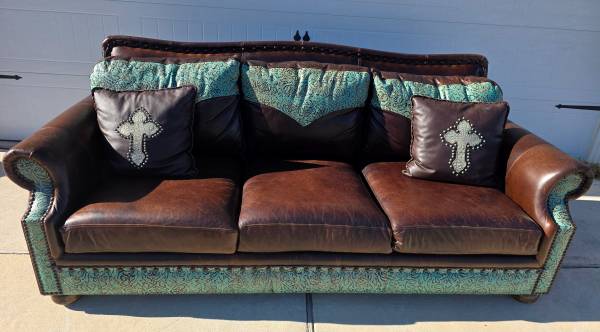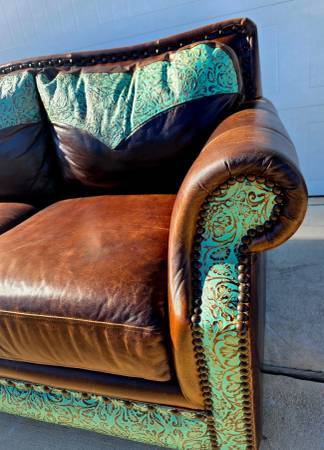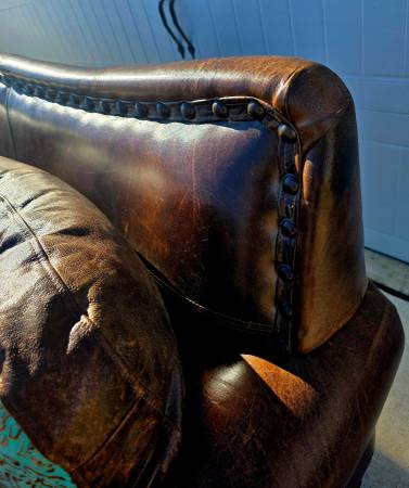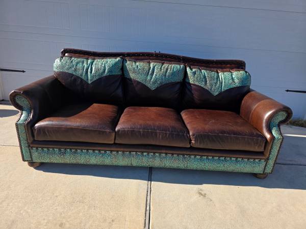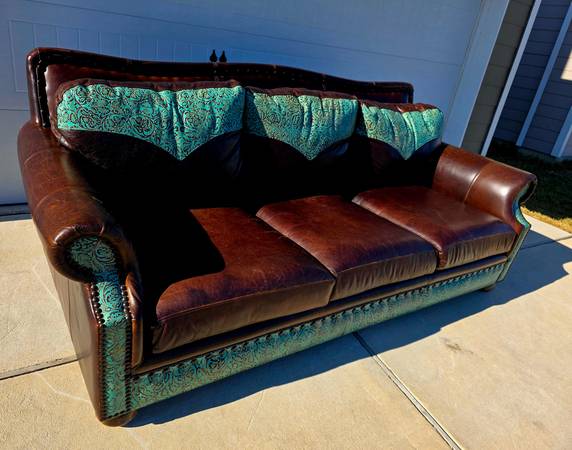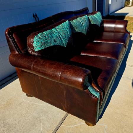Beautiful one of a kind custom built Genuine Leather full length sofa... Think 2-toned Restoration Hardware quality Very comfortable Structurally Sound Very good condition as seen $4,000...