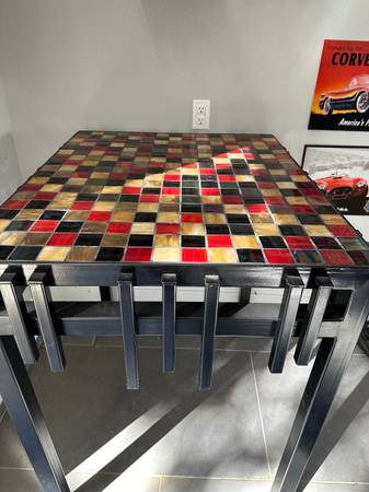Custom designed & made. Heavy iron base with glass mosaic tile top.