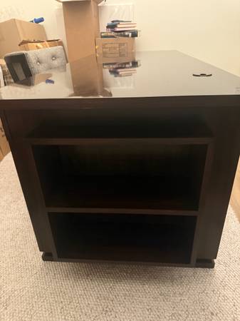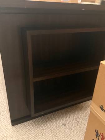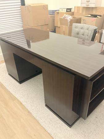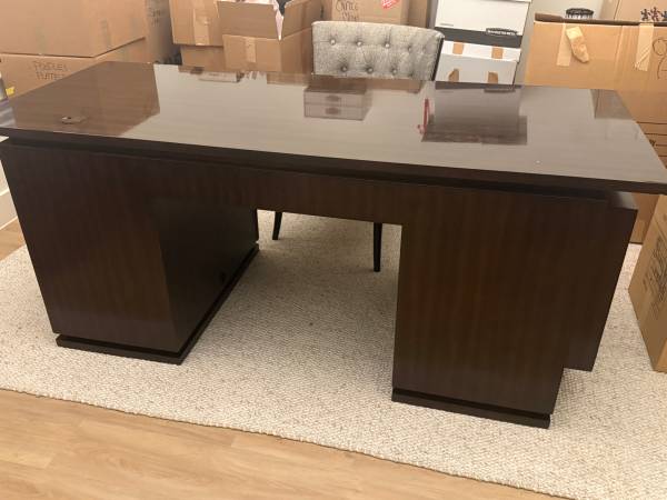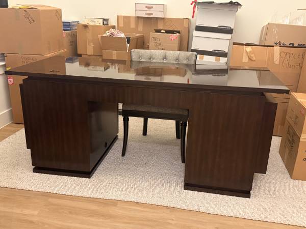 Zebrano veneer writing surface, two file drawers, a pullout shelf; exterior has open shelving on both sides. Purchased in 2023, paid approximately $11,000. Moving, must sell.