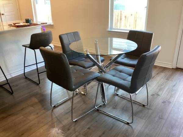 Glass and chrome dinette set for sale and 4 chairs excellent condition hardly use new 700 dollars DOWN From 250.00