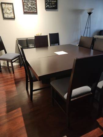 Enhance your dining experience with this modern rectangular dining set, eigth comfortable seats, making it perfect for family gatherings and dinner parties. The warm new brown wood finish and curved, armless upholstered dining chairs offer both style and comfort.