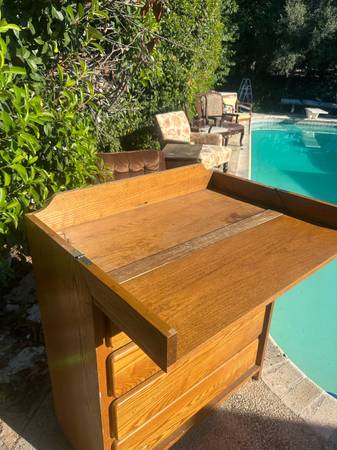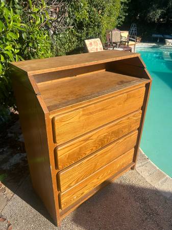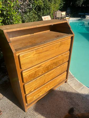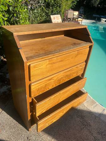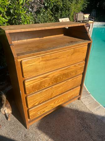 Sturdy wooden dresser with four drawers. Delivery available for small fee, depending on location. Located in your bitters in 281. Length 35 inches Width 16.5 inches Height 43 inches
