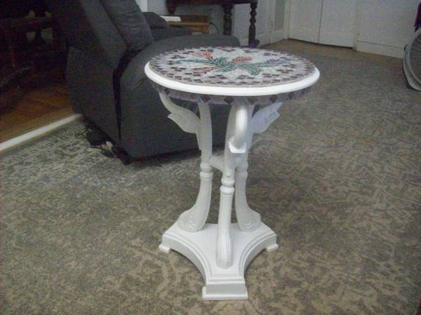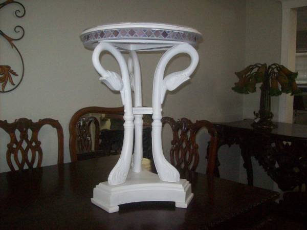 The polychrome mosaic top features a floral spray set within a geometric monochrome surround and a geometric mosaic frieze. It is .supported by carved triple swan-neck supports terminating in scroll feet, all resting on a triform plinth base,