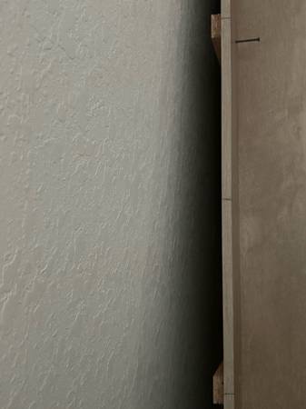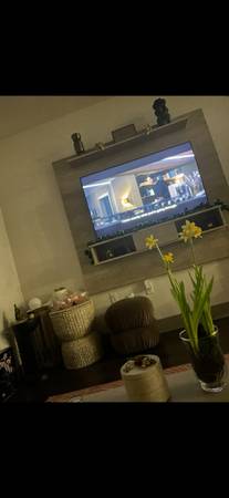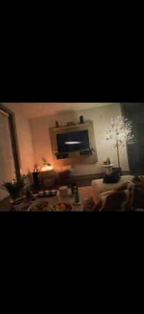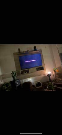 Entertainment center as pictured. The center has supportive custom wood pieces on the back in order to prevent wall damage. It’s a whitewash/lighter wood combination. Love this piece and hate to let it go but it won’t work in my new home.
