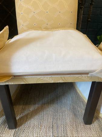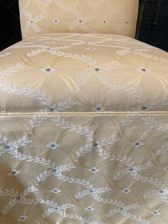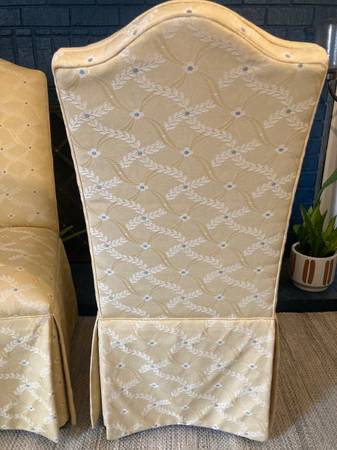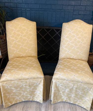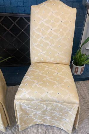 Parsons chairs in a butter cream yellow with laurel leaf design and specks of baby blue in a custom upholstery. Classical skirting and finished with self-welting throughout. Good size and really comfortable. In near excellent condition - Smoke and Pet free home.