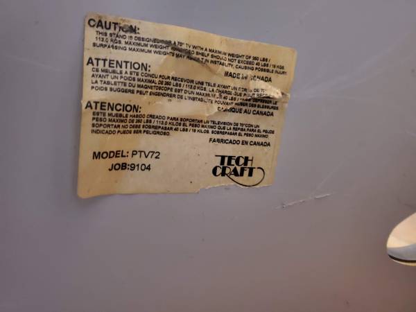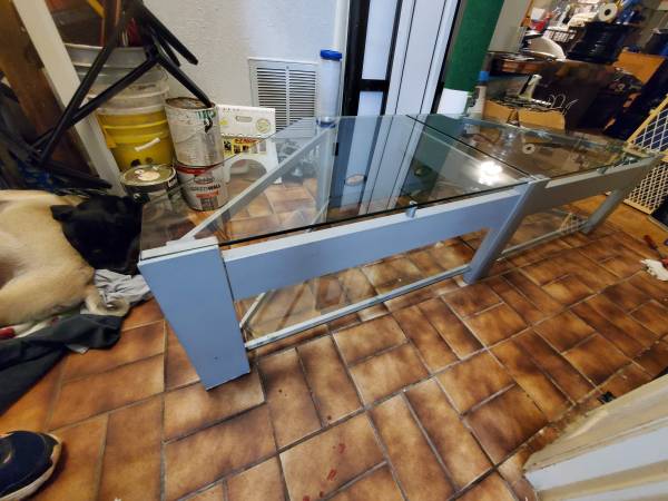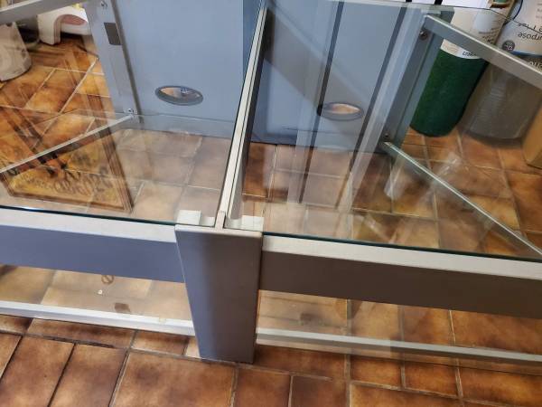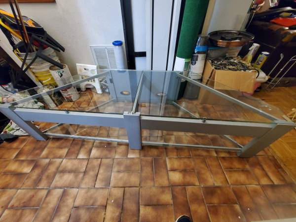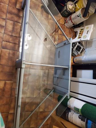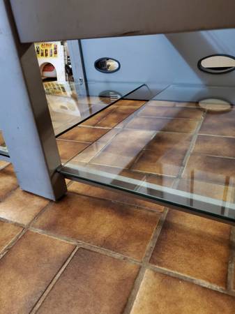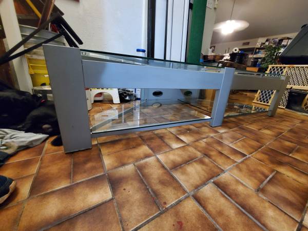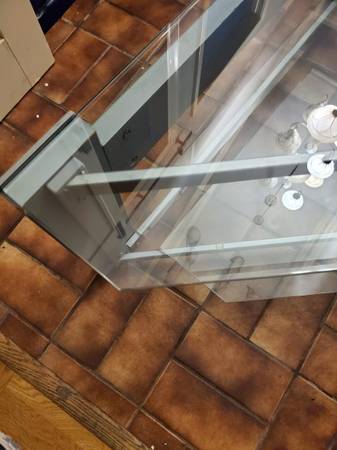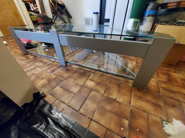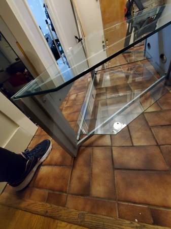 Large glass and metal entertainment center. Glass panes can hold up to 260lbs. Model: TC - PTV72 by TechCraft. Retails $400 or more. Has been disassembled for easy storage and move. All you need to reassemble is an allen wrench.