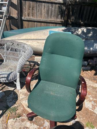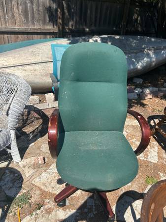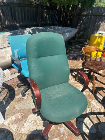 Used green office chair with wooden armrests. Please be warned that past owner had pets and chair could use a cleaning before use. Perfect for a moment of ponder and reflection. Delivery available for a small fee, depending on location. Located near Bitters and 281