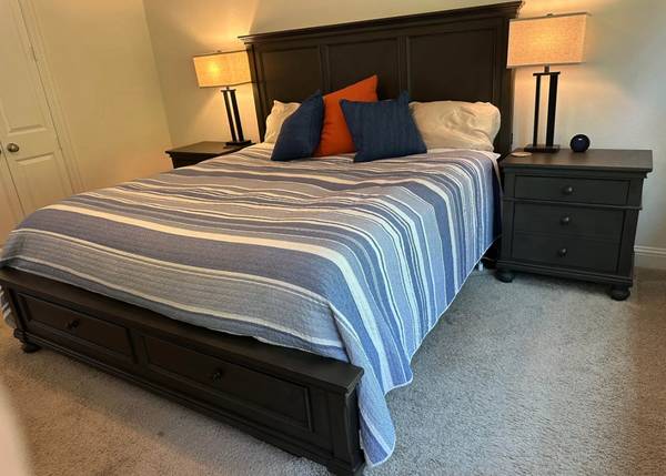 Only 1 year old in excellent condition. Mattress is in excellent condition too. 2 night stands, 8 drawer tall dresser (top left side for jewelry) with mirror & TV bracket (attaches to back if you want to use mirror elsewhere), 5 drawer dresser with pull out wooden rods on each side - will throw in lamps when purchasing everything!