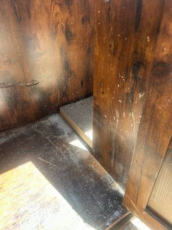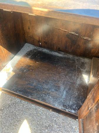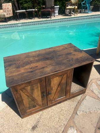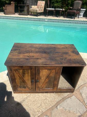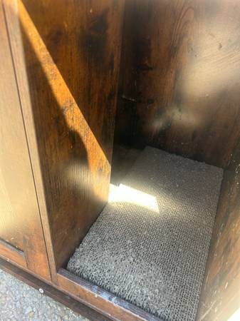Sturdy cabinet with two doors, cabinet space design for litter box small opening, so cats can move in and out a classy accessory for any cat owner., Delivery available for a small fee, depending on location. Great accent to any home or apartment. Solid in current condition or awesome project piece.
