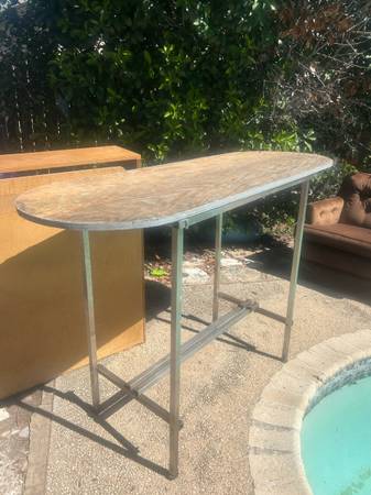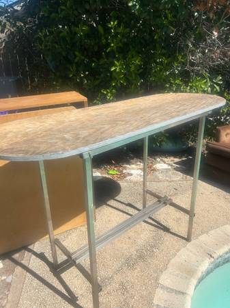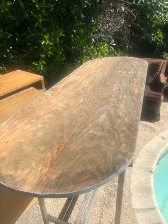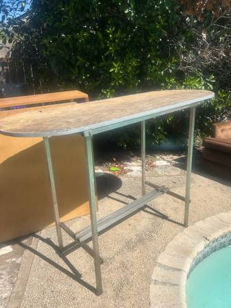 Sturdy metal frame with a wooden top, suitable for outdoor use. Delivery available for a small fee, depending on location. Great accent to any home or apartment. Solid in current condition or...