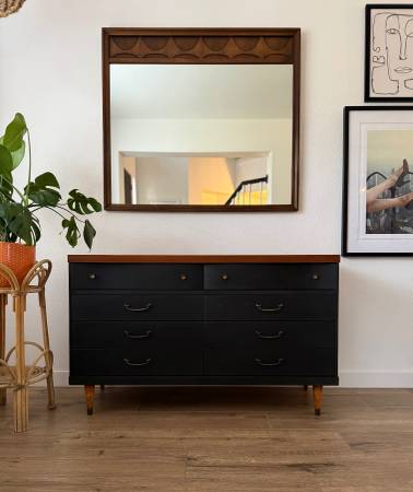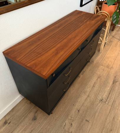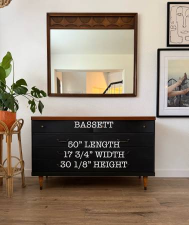 Vintage mid century black dresser by Bassett. Solid and well built with dovetail joinery. Drawers slide easily.
