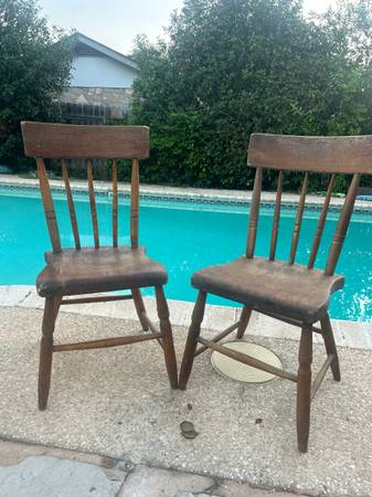 Two vintage wooden chairs in used condition. Both chairs for 20. Please be warned solid wood construction great project to paint but slightly smaller than normal dining room table, chairs. Delivery available for small fee, depending on location. Located in your bitters in 281.
