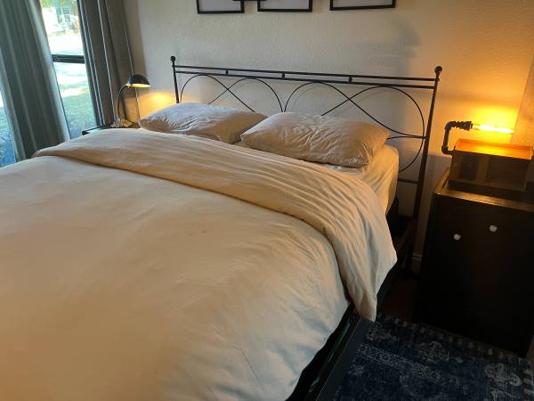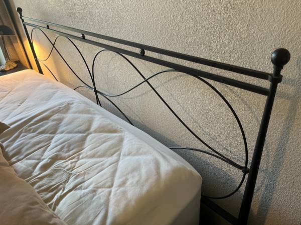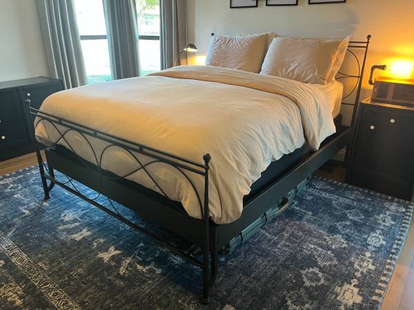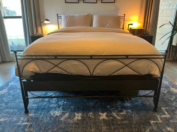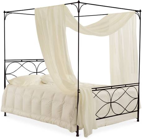 Cantori “Raphael” queen wrought iron canopy bed imported from Italy. Frame made of laser-cut wrought iron, entirely hand-polished and hand-decorated; nail heads applied by using a hot-process. Excellent condition. Can be used with or without canopy option (all canopy attachments included). From a smoke-free home. Currently retails for over $3,000.
