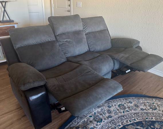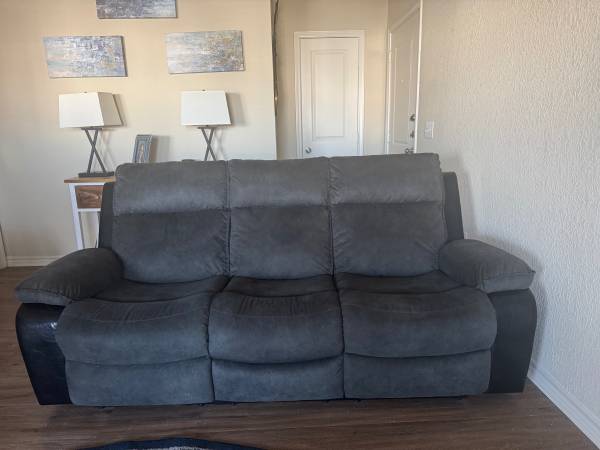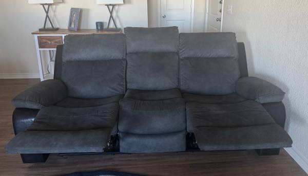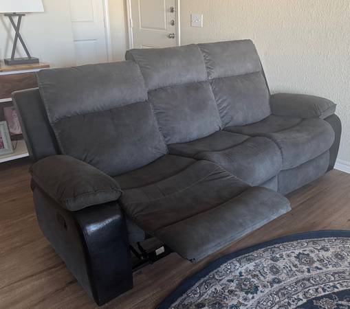 Dark grey microsuede fabric and faux leather. Very easy to clean. Has additional protection added to the microsuede. Reclines in two positions. You can lean back with feet up or all the way back. The pillowing provides lumbar support for extra comfort. There are no stains or scratches. There are marks on the back from reclining against the wall. I put it in the pictures. Just to let you know, I am on the 3rd floor. West Oaks Apts. Vance Jackson.