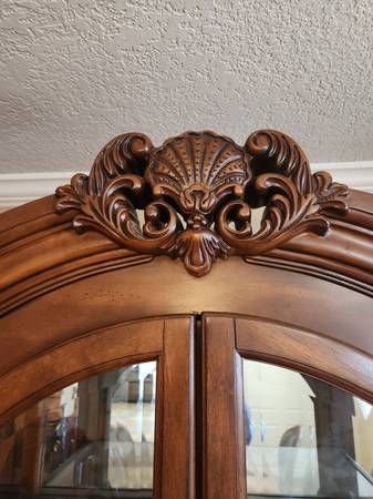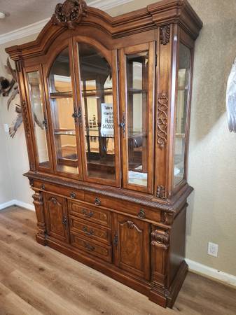 Solid mahogany wood table and two extension leaves with 6 chairs and Hutch, good quality furnish. Very heavy items, bring your own helpers. REDUCED PRICE. Must pickup near Perrin-Beitel at 9210...
