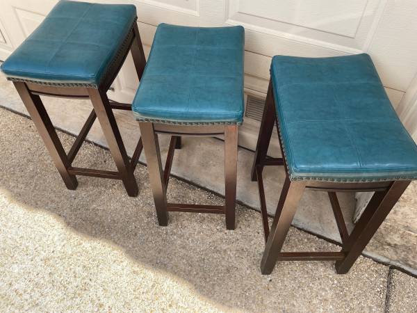 (1) Saddle Style Bar Stool Aqua color seat with dark brown wood base 26.5 inches tall to seat Seat is 12 inches by 17.5 inches *All proceeds will be donated to the San Antonio Humane Society and the...