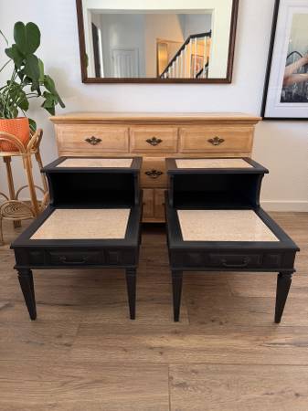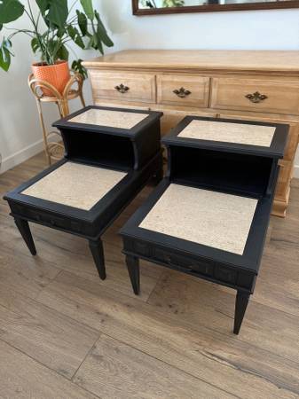 SET OF SOLID WOOD ITALIAN PROVINCIAL TABLES WITH MARBLE INSERTS AND FAUX DRAWER.