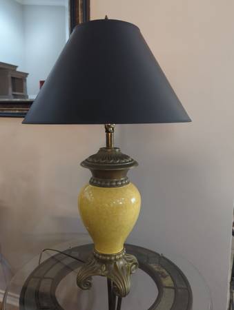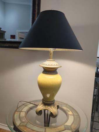 Vintage-style table lamp with an urn-shaped body, made of ceramic, and a brass-finished fluted base. The lamp has a black tapered shade. The design has been described as neoclassical, Hollywood Regency, or mid-century modern, with some similar items dating back to the 1970s.