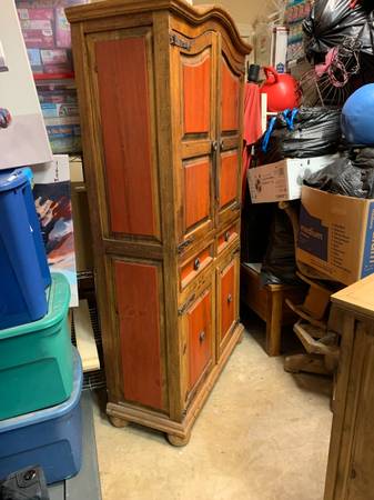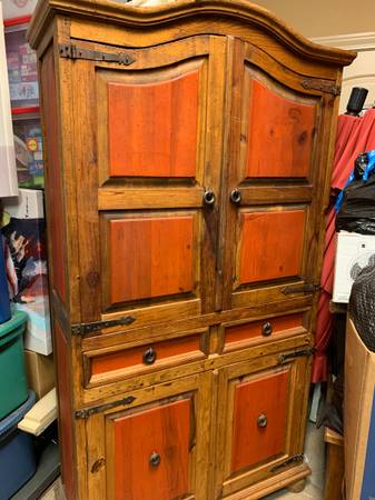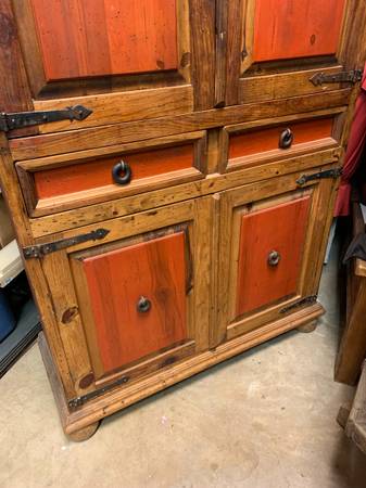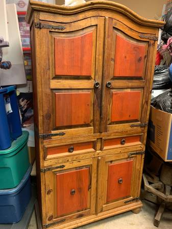 Mexican import wood cabinet. Can be used as wardrobe or tv cabinet. 78 H x 41 W x 17 1/2 D. Back has a square hole cut to fit a tv. Has one drawer. Very good condition. Will except reasonable offers...