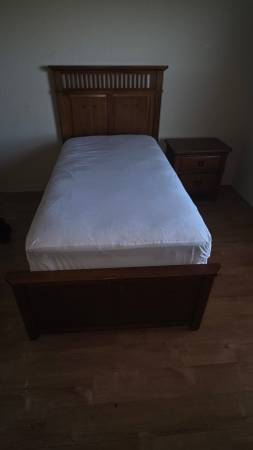 Twin bed frame, night stand, six drawer dresser, and mattress. Mattress has original plastic plus mattress protector. Asking $350 OBO just need gone.