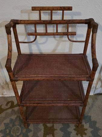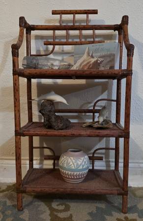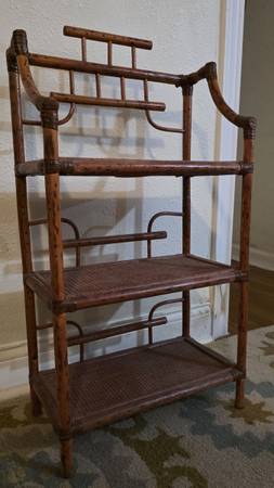 This type of étagère is typically made from rattan or bamboo and often features woven shelves and a distinctive top that resembles a pagoda. The design is associated with Chinoiserie and Hollywood Regency styles.