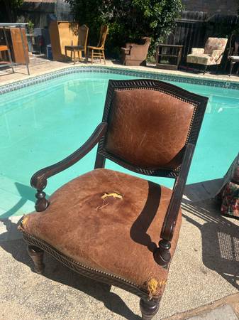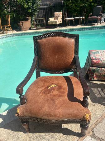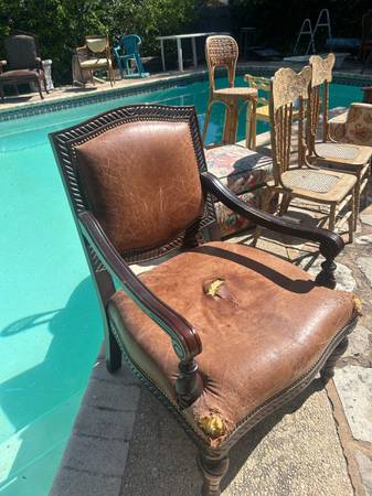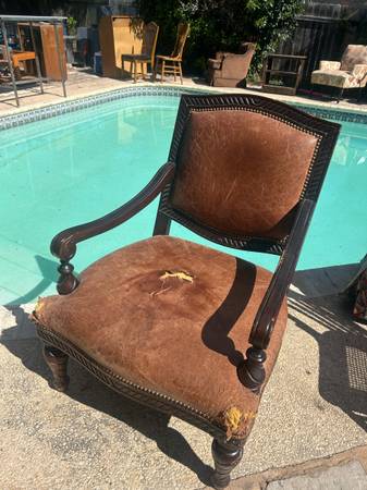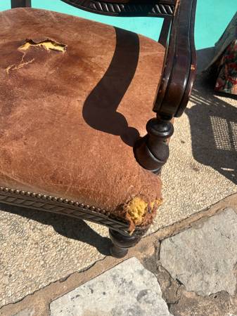 Brown leather seat with wear and tear, wooden frame. Please be warned item is a project piece. Most likely been around animals and leather would need repair. Vintage wood frame is solid. Awesome piece to inspire the imagination. Perfect for a moment of ponder and reflection. Delivery available for a small fee, depending on location. Located near Bitters and 281