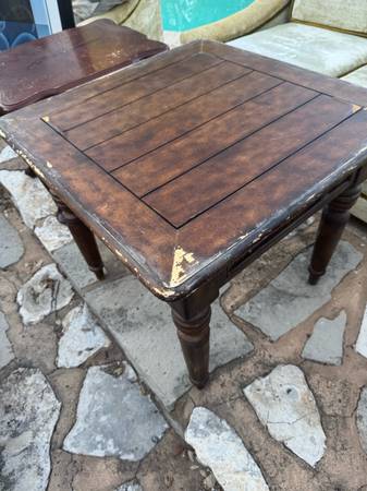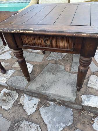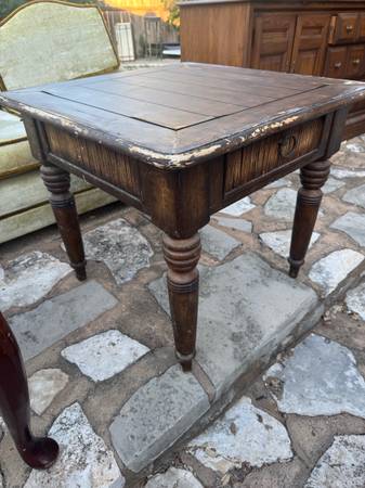 Sturdy vintage wooden table with carved legs. Some wear on edges. Delivery available for small fee, depending on location. Located in your bitters in 281. Length 28 inches Width 28 inches Height 24...