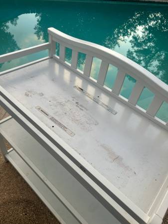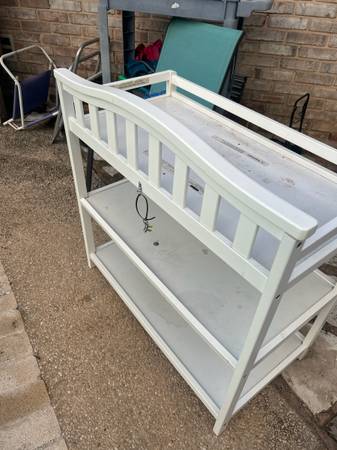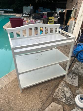 Sturdy white changing table with three shelves. Delivery available for a small fee, depending on location. Great accent to any home or apartment. Solid in current condition or awesome project piece....