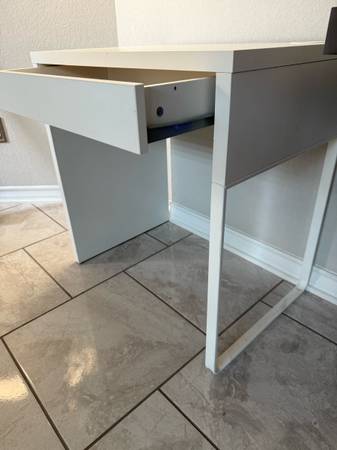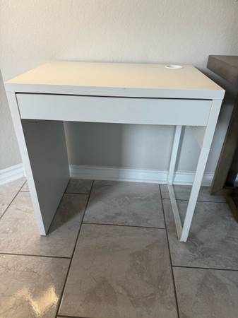 Modern white desk with a single drawer, perfect for home office use. Height 30” x 28” width Must pickup, price firm