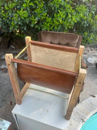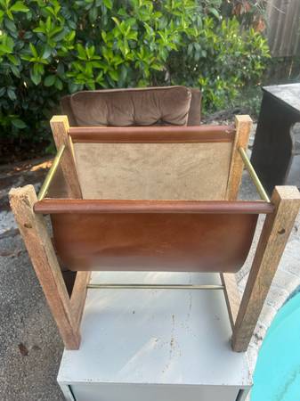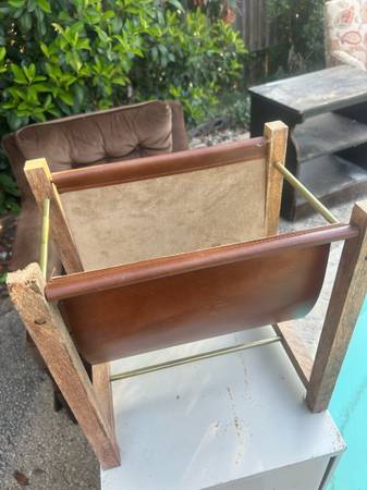 Vintage wood and leather magazine rack with brass accents.. Located near bitters and 281.