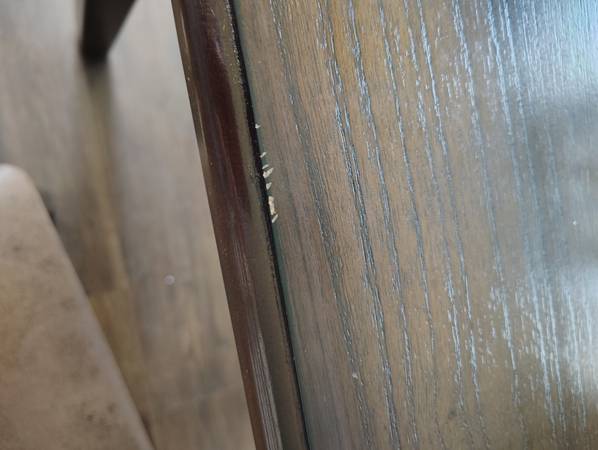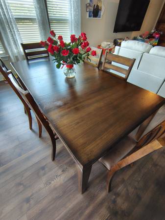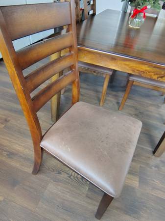 This ad is for a wood dining room table with a leaf (as pictured) and 6 chairs. It measures 77" long with the leaf (which is 18") and 42" wide. It's 3 years old, originally purchased from Living Spaces for $1179.65 (including tax and delivery) and it comes with original paper work. My Mom is moving closer to us and this set won't fit in her new place. There is one bigger scratch (see pic) and a few other more minor scratches (not pictured, can only be seen closer up) on the surface. Locals only. You haul. Cash only. Call/text Cindy 9am to 9pm if interested.
