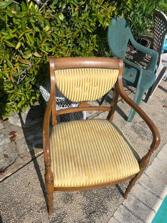 Elegant wooden chair featuring yellow striped upholstery. Perfect for any room. Please be warned item needs a good cleaning. Perfect for a moment of ponder and reflection. Awesome project piece. Delivery available for a small fee, depending on location. Located near Bitters and 281