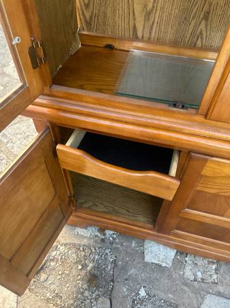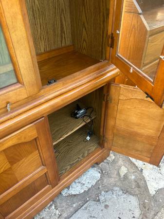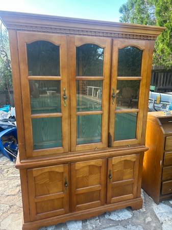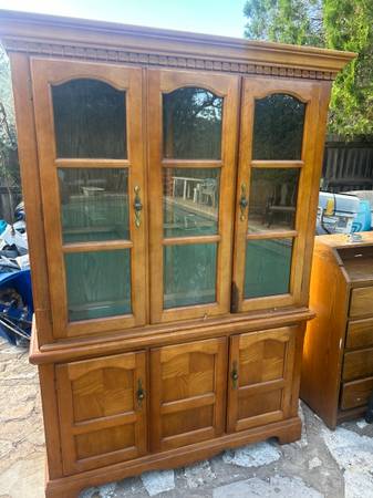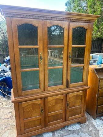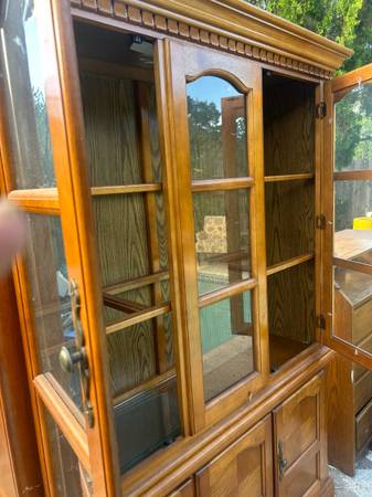 Elegant wooden china cabinet with glass doors and ample storage. Please be warned one glass shelf missing. Delivery available depending on location. Great accent to any home or apartment. Solid in...