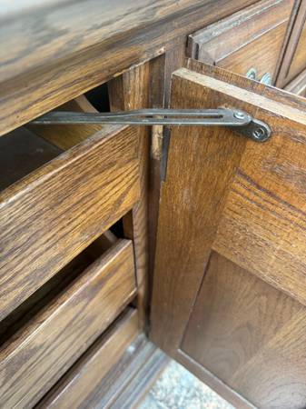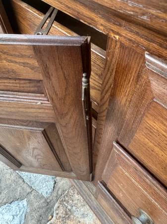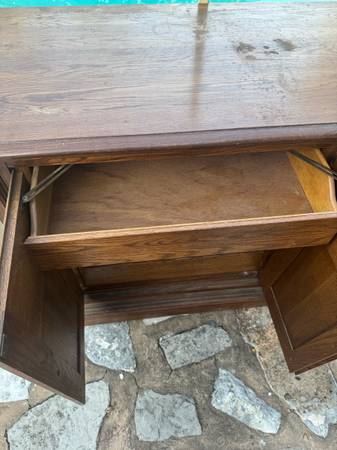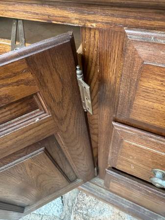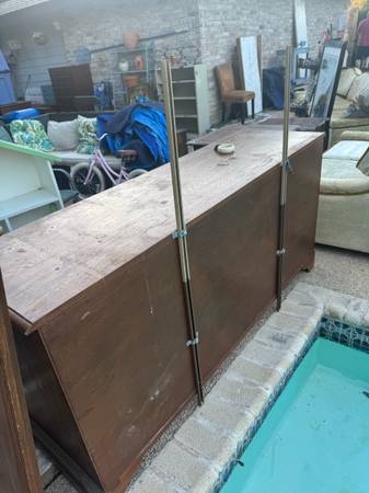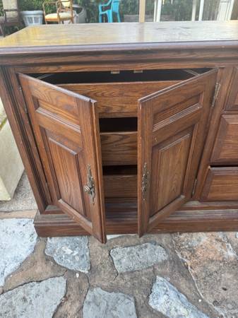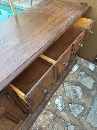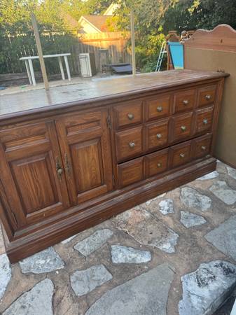 Spacious wooden dresser with multiple drawers and cabinets. Delivery available for small fee, depending on location. Located in your bitters in 281. Length 65 inches Width 19 inches Height 78 inches