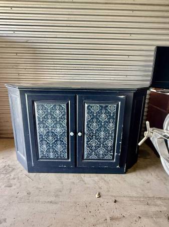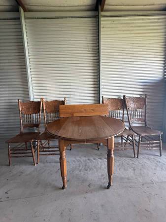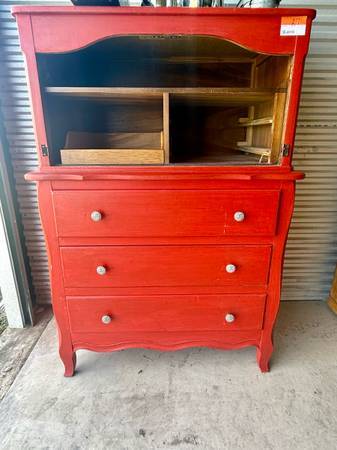 Antique, vintage and modern furniture for sale! Solid oak wood 4 chair dining table with 1 leaf $225 Blue China cabinet solos custom wood 5’ w x3’ d x 8’ t $325 Red dresser project piece solid wood...