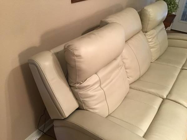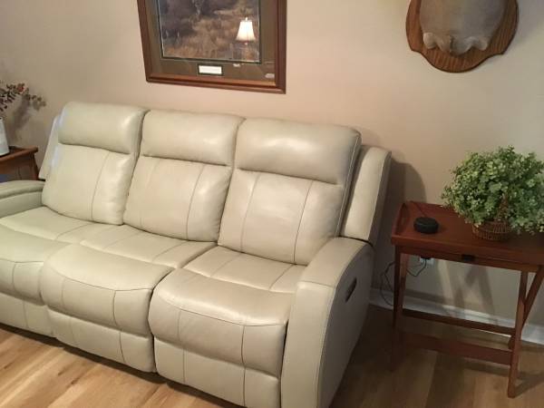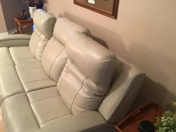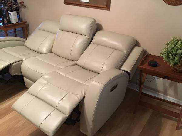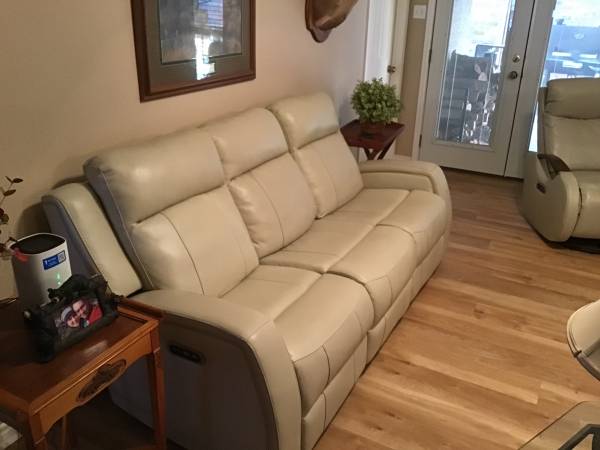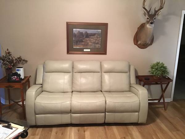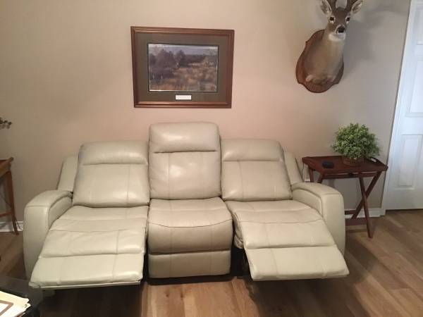 Absolutely flawless, excellent like new condition. Mushroom color. Dual leg recliners as well as head and neck for complete relaxation. Comes with dual USB ports. Measurements 83 inches total length, 34 inches deep, 39 inches to top of headrest. Call or te t show contact info