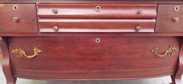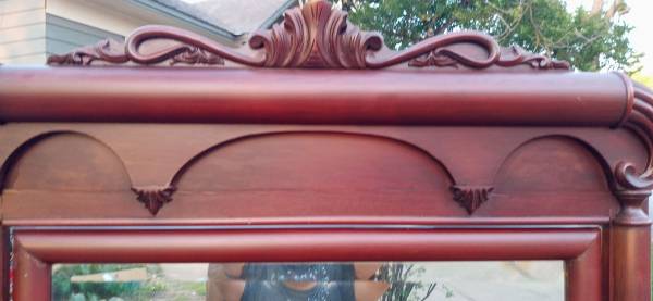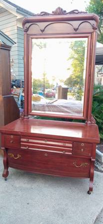 100% Mahogany wood beautiful Victorian Dresser (28 high x 46 width x 23 depth) and Mirror (55 high x 38 width x 1 depth).,it is in excellent condition with some scuffs mainly on one side but nothing major.,this pieces was refinish at one point and they did a great job on it. Thank you! "Seguin Tx 78155"