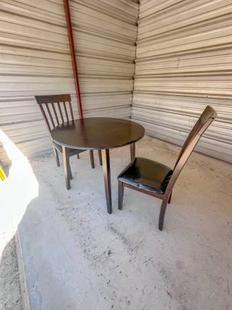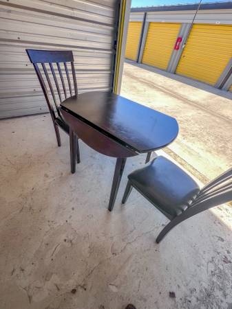 Dining table with two chairs. This table is perfect for tight places and has fold down edges that allow it to be placed against a wall if needed. It also has two chairs (making value over $200). There are a couple of small scratches shown in the pictures, but I believe they can be covered easily with wax/polish (also, I've used walnuts on other pieces before). It is currently in storage (which I am selling all the contents) and has the legs removed for easy transport.