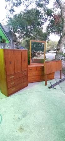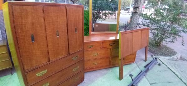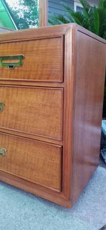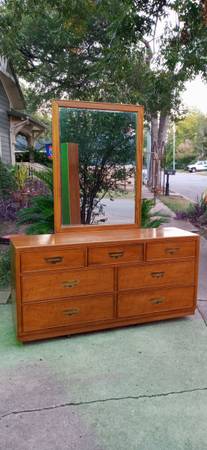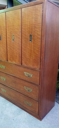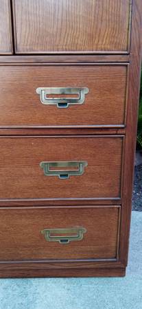 100% Oak wood 5 pieces Campaign bedroom furniture made Bernhardt Company which includes., Dresser (32 high x 63 width x 18 depth), Mirror (45 high x 33 width x 1 depth), Chest /Armoire (60 high x 40 width x 18 depth), Queen Head board/ Metal frame on wheels and Mattresses (Not pictured)., these pieces are in like new condition with original metal pulls and tracks almost non scuffs are present!! Thank you and "Sold As A Set Only , No delivery available ,Sorry!"