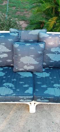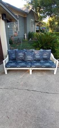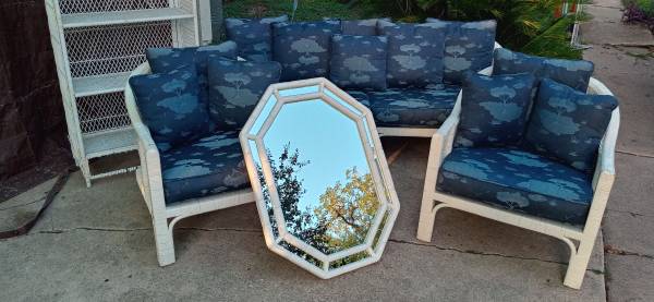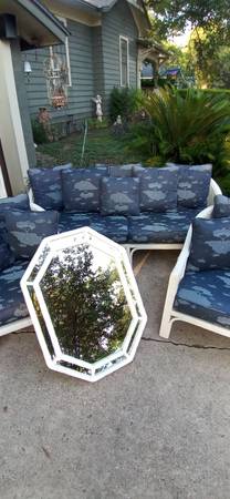 100% White wicker Sunroom set in good condition which includes., One large Sofa (To the seat 17/back part 28 high x 75 width x 34 depth) pair of Chairs (To the seat 17/ back part 24 high x 24 inner area x 32 depth) , hexagon Mirror (35 high x 27 width x 1 depth) plus a 4 tiear Tall Shelf (80 high x 28 width x 14 depth)., this set has the original blue upholstery and it is in great condition, No smell or ripped of any kind!!!. Thank you and SOLD AS A SET ONLY!! Terrell St Seguin Tx 78155. Please text me ONLY IF SERIOUSLY INTERESTED!!!