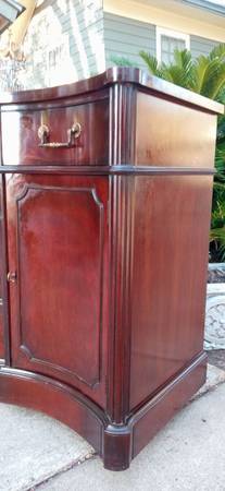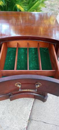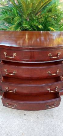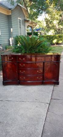 100% Mahogany wood, beautiful 4 extra large and two small drawers Vintage Serpentine Style Federal Style Buffet Cabinet made by White Fine Furniture with original nice metal pulls. It is is excellent condition with minimum scuffs. Thank you!!! (35 high x 65 width x 23 depth)