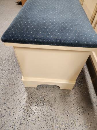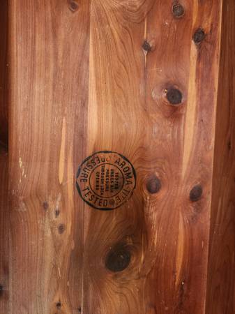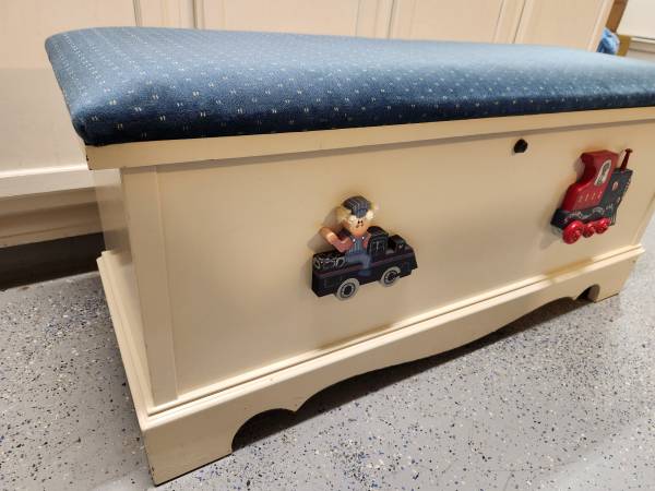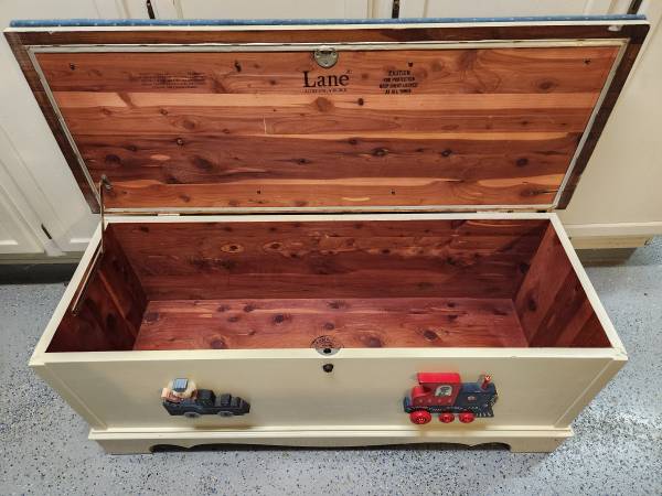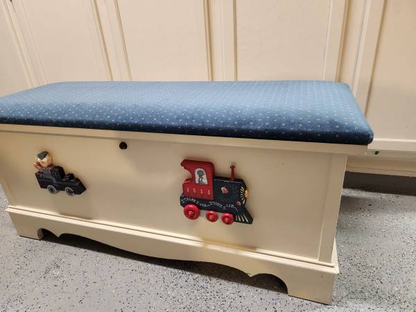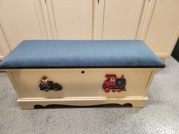 This is a very well-made aromatic cedar chest. My wife owned it prior to our marriage and when we had children, I repainted it and had the seat reupholstered. The children have left for college, and this chest is now surplus to us. It measures approximately 45in long x 18in. deep and 20 in tall. The wooden trains are held to the front with two 23ga pin nails that can be easily removed if you want. You will not be disappointed.