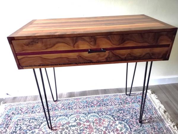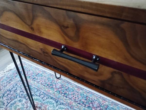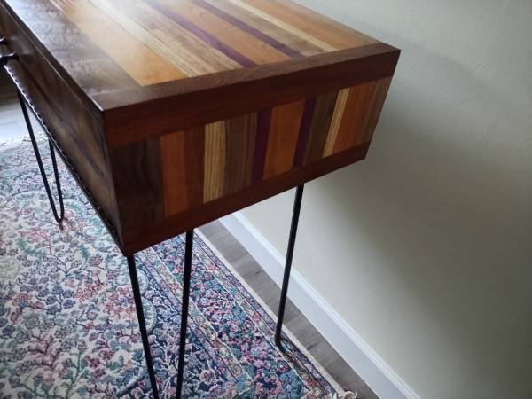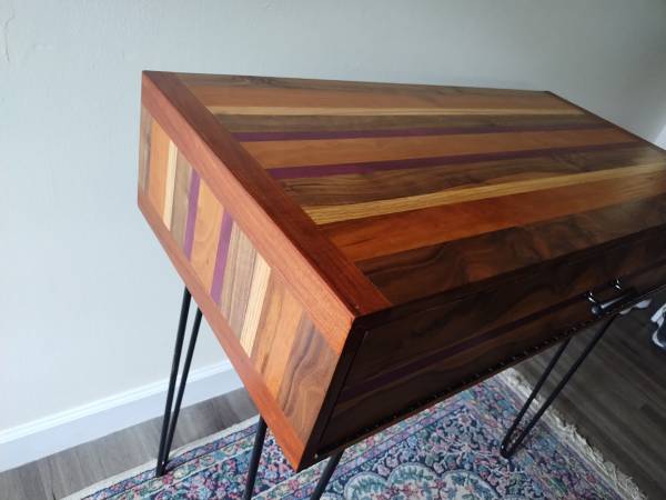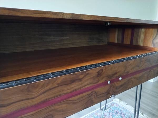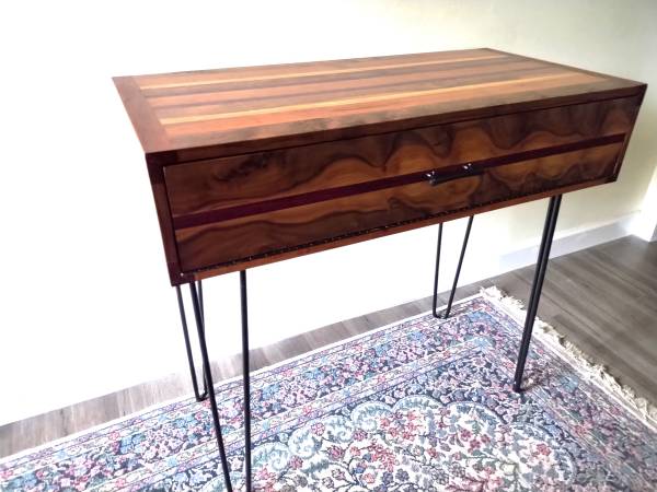 This beautiful piece was made in our shop out of many different and exotic hardwoods. The gorgeous natural grain of black walnut is featured on the drop front cabinet door while the top and sides have accents of cherry, oak and purple heart. Simple black hairpin legs finish the table off. 37"wide x 18.25 deep and 34.5" high