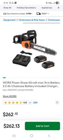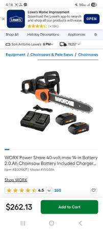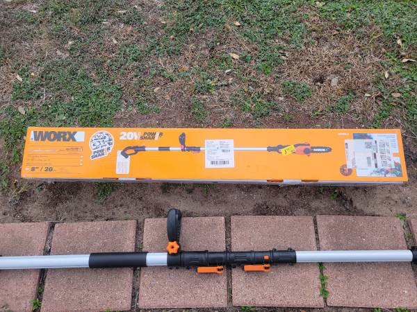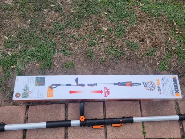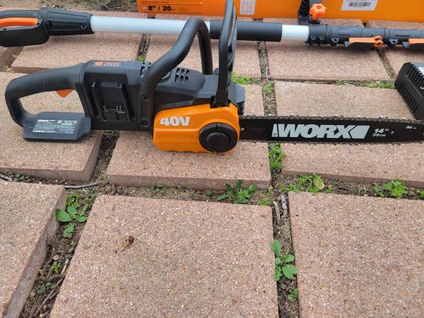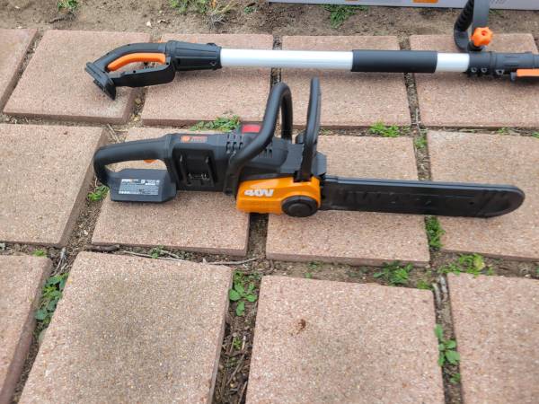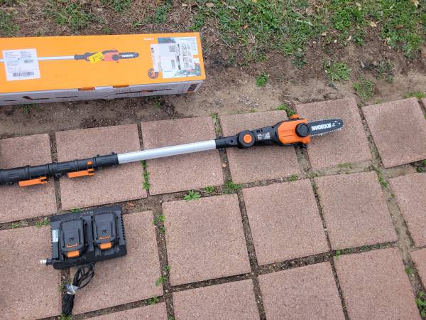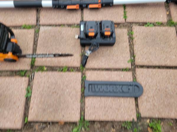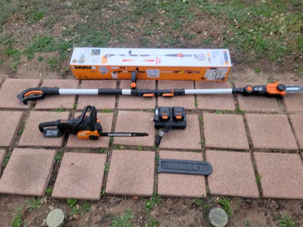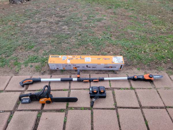 Worxs Polesaw and chainsaw 14inch with batteries and charger used once payed over 400.00 for all in new condition