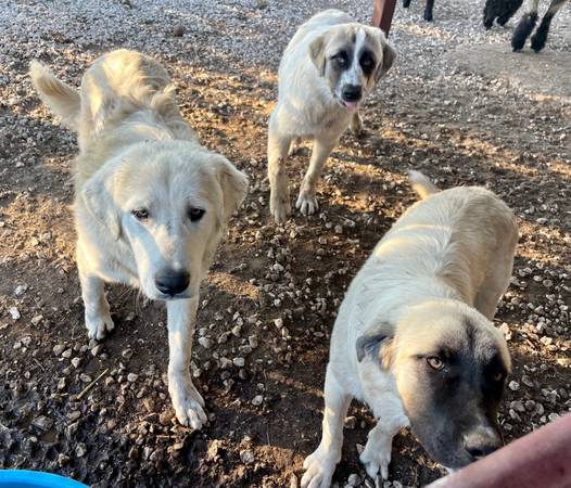 3 Great Pyrenees and GPxAnatolian. 7-9 months old, ready to work. Intact males. Born in pasture with sheep, have been around sheep their entire lives, ewes with lambs, pens with rams, also exposed to cattle. Socialized well , easy to catch. Trained with self feeder and jump gate. Exposed to hotwire.