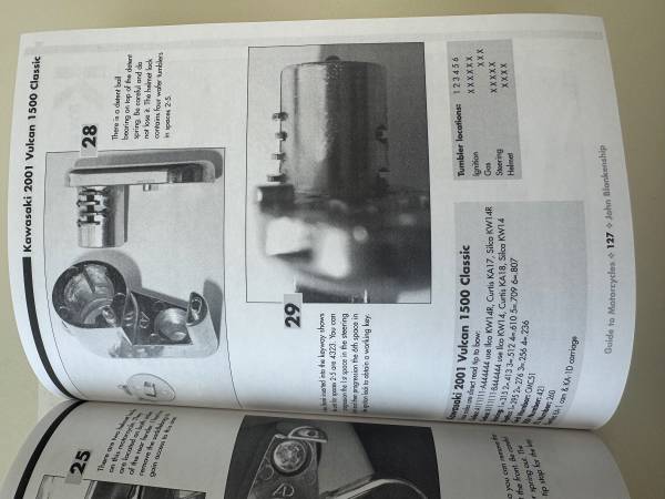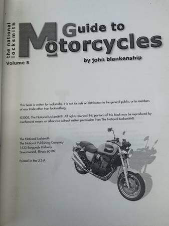 7 Volume set. National Locksmiths Guide to Motorcycle key generation. Complete by step instructions and detailed photos on how to make keys from scratch. Used but in good condition. $250.00. Cash...